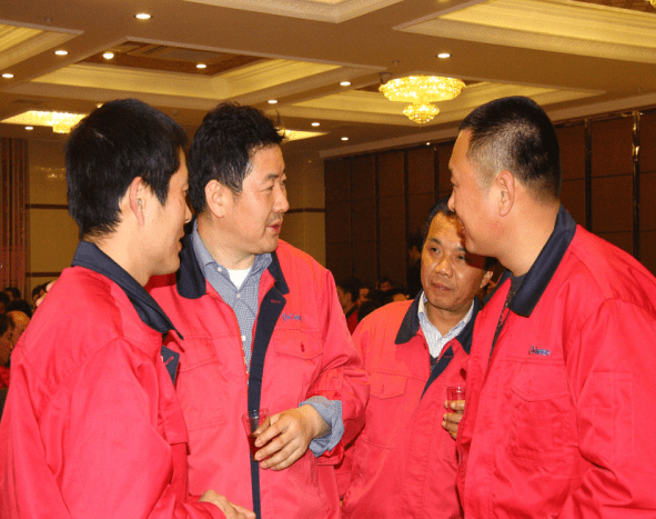 图为:确成硅化董事长阙伟东先生仔细询问员工工作生活情况。